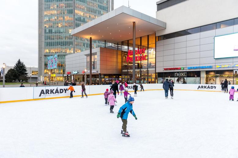 Operating hours daily from 9:00 AM – 9:00 PM. All-day admission 100 CZK. Skate rental 80 CZK. Children under 6 years free. Ice rink dimensions 30 x 16 meters.