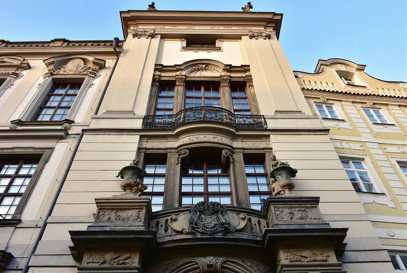 The intersection of Charles and Hus Streets is reached by the southern part of the facade of the Clam-Gallas Palace, one of the most important Baroque palace buildings in Prague. It is a magnificent example of a monumental aristocratic residence situated in a small medieval-type urban development. The palace was built in the High Baroque style on the site of an older building in 1714-18 according to a design by J. B. Fischer of Erlach for Jan Václav Count Gallas. Among others, M. B. Braun and his workshop contributed to the decoration of the building (portals with atlants, statues of ancient gods in the roof part, cherubs inside and vases on the staircase), the painter C. Carlone, stonemason D. A. Rappa and the plasterers R. Bolla, S. Bussi and G. Fiumberti.